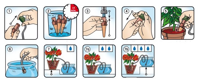 Чтобы начать использовать систему автополива, растению не нужно менять грунт на новый, нет необходимости пересаживать в специальные горшки, оно может оставаться на привычном месте. Блюмат вставляется в землю, окружающую растение, трубка разматывается и утяжеляющий кончик трубки упускается на дно емкости с водой. В одну емкость с водой можно опускать сколь угодно много трубочек от блюматов. Главное следить за уровнем воды в емкости и не допускать высыхания воды. Если случается высыхание емкости, то блюматы достаточно легко «перезапустить». Если же вы хотите удобрить растение, то достаточно добавить жидкое удобрение в емкость с водой.